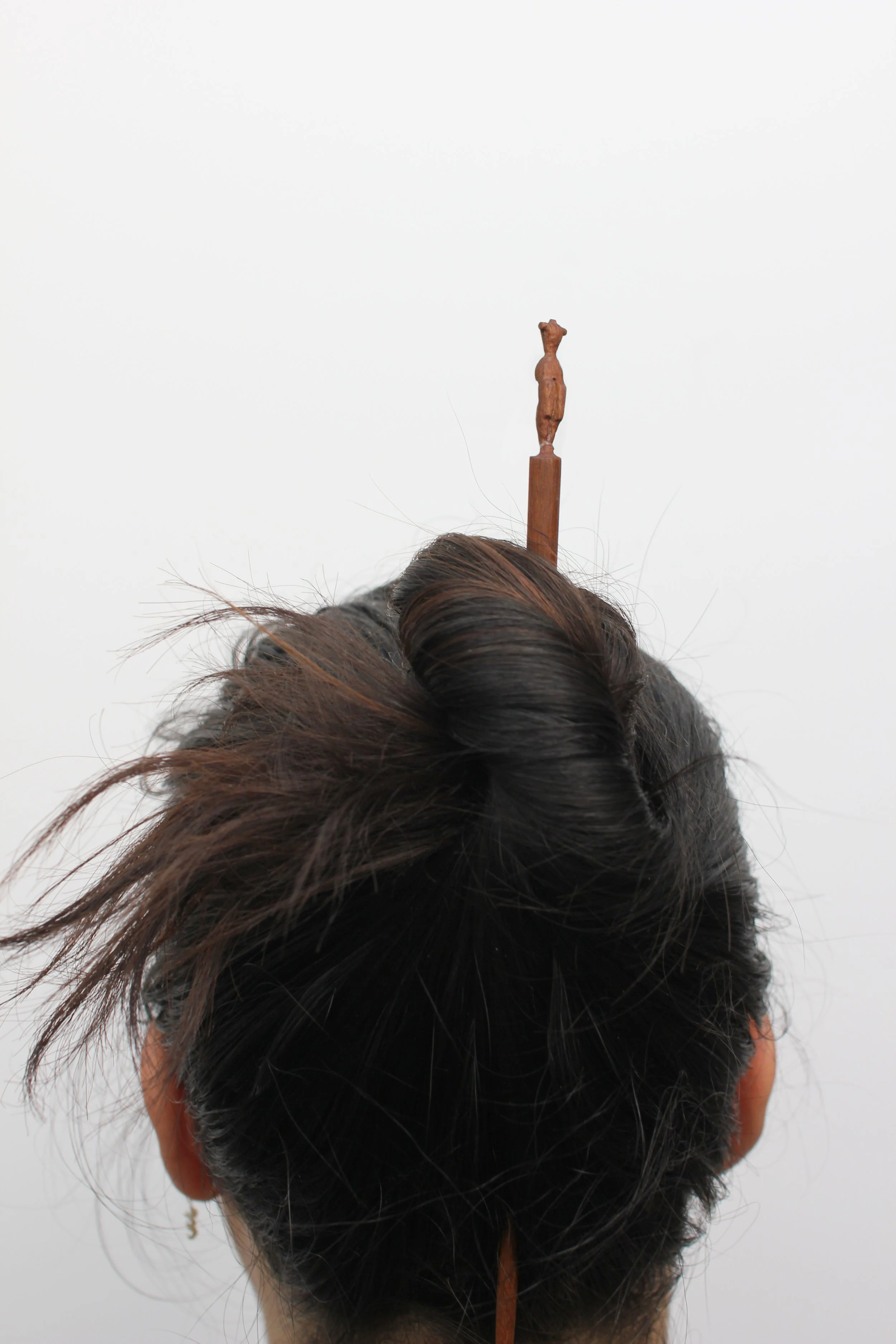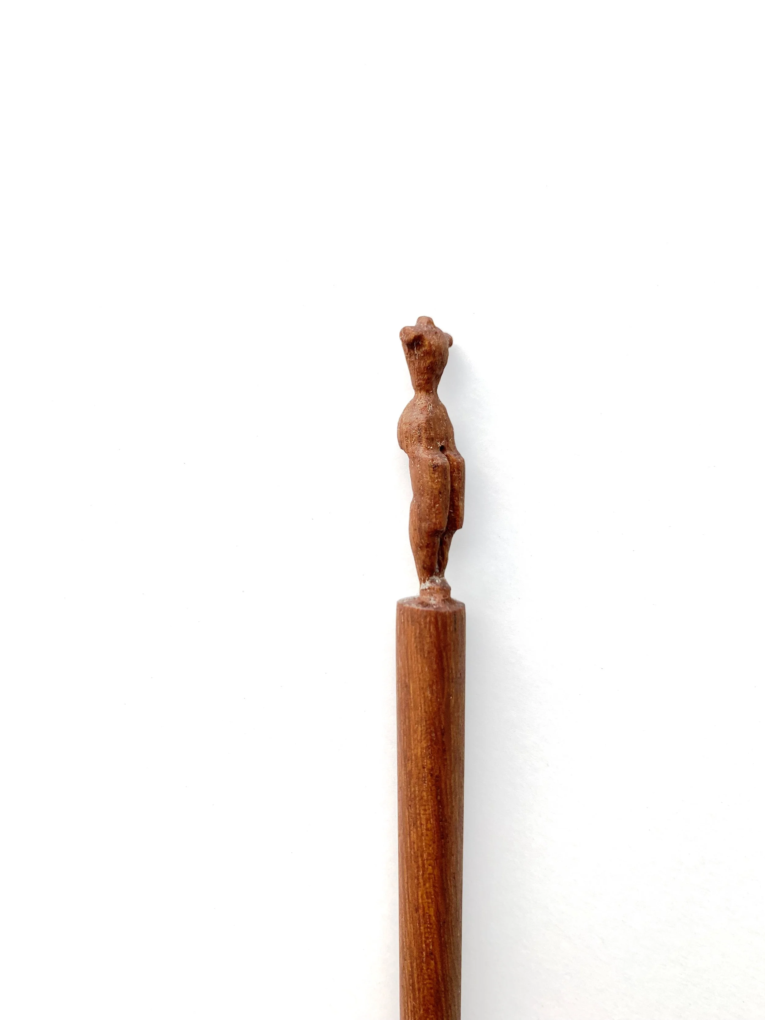 Miniature sculpture of woman, made on the end of a wooden chopstick for a friend to use as a hair pin.